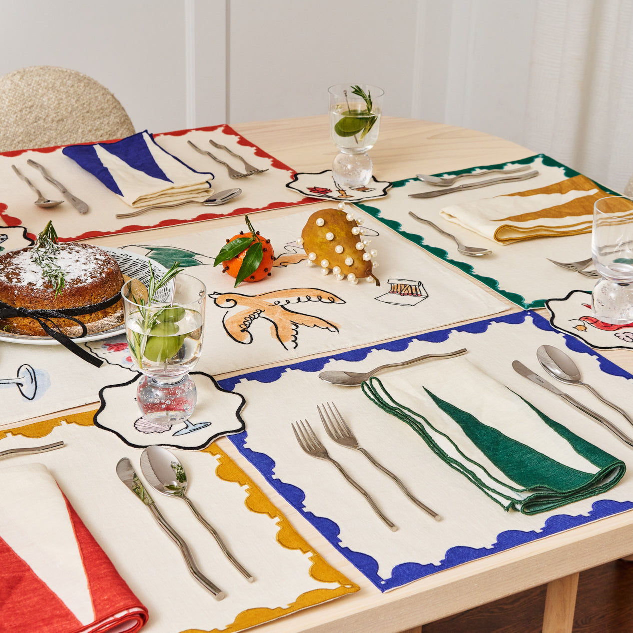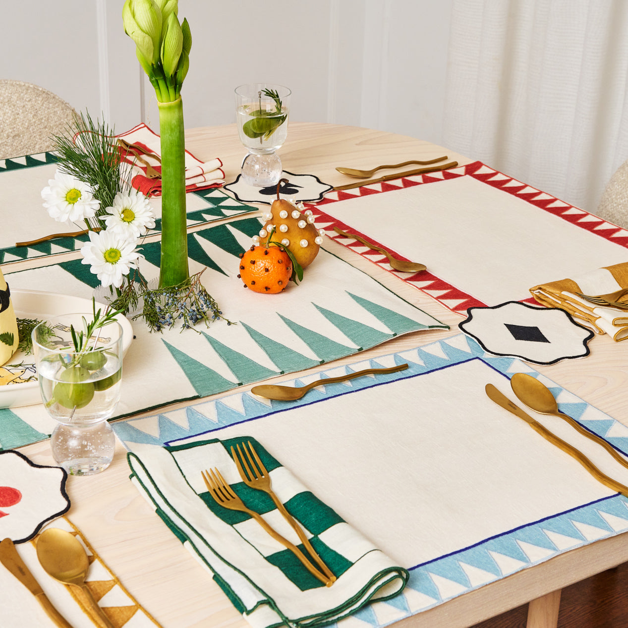 Colorblock Embroidered Linen Placemats in Blue (Set of 4)