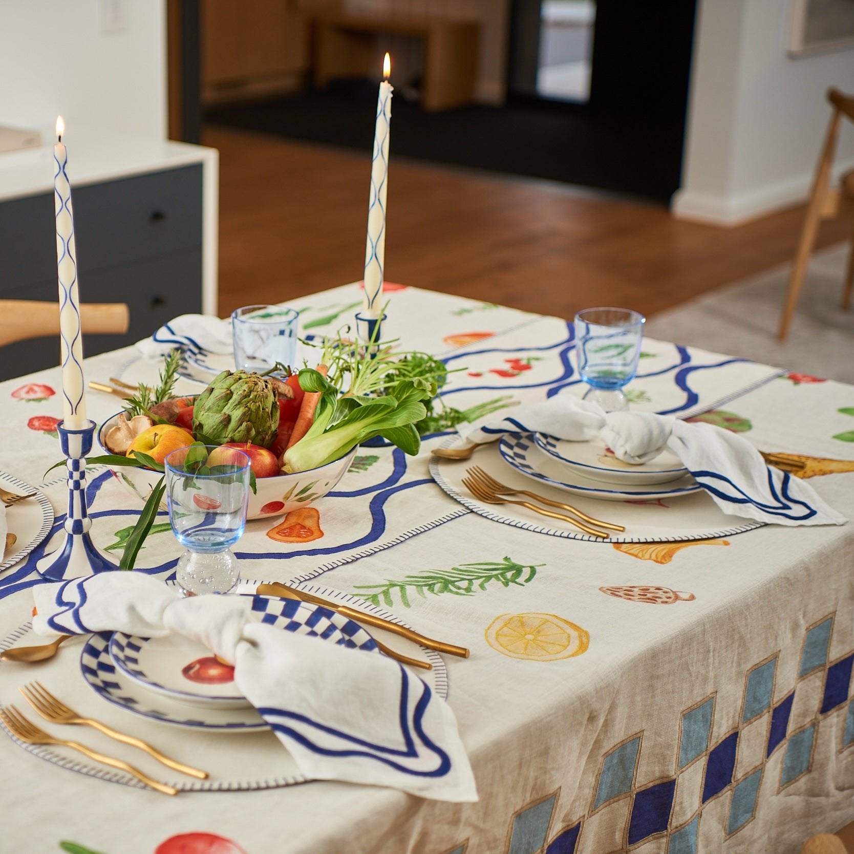 The kitchen garden comes to life in this stunning, timeless embroidered tablecloth that features vibrant fruit and vegetable motifs that evoke sumptuous Renaissance art. Available in round and rectangle silhouettes for versatility, with charming red, green and blue colorways, this machine-washable tablecloth is made with high quality 100-percent durable linen fabric that will feel and look better over time. It's the perfect piece to last and be passed down through generations.