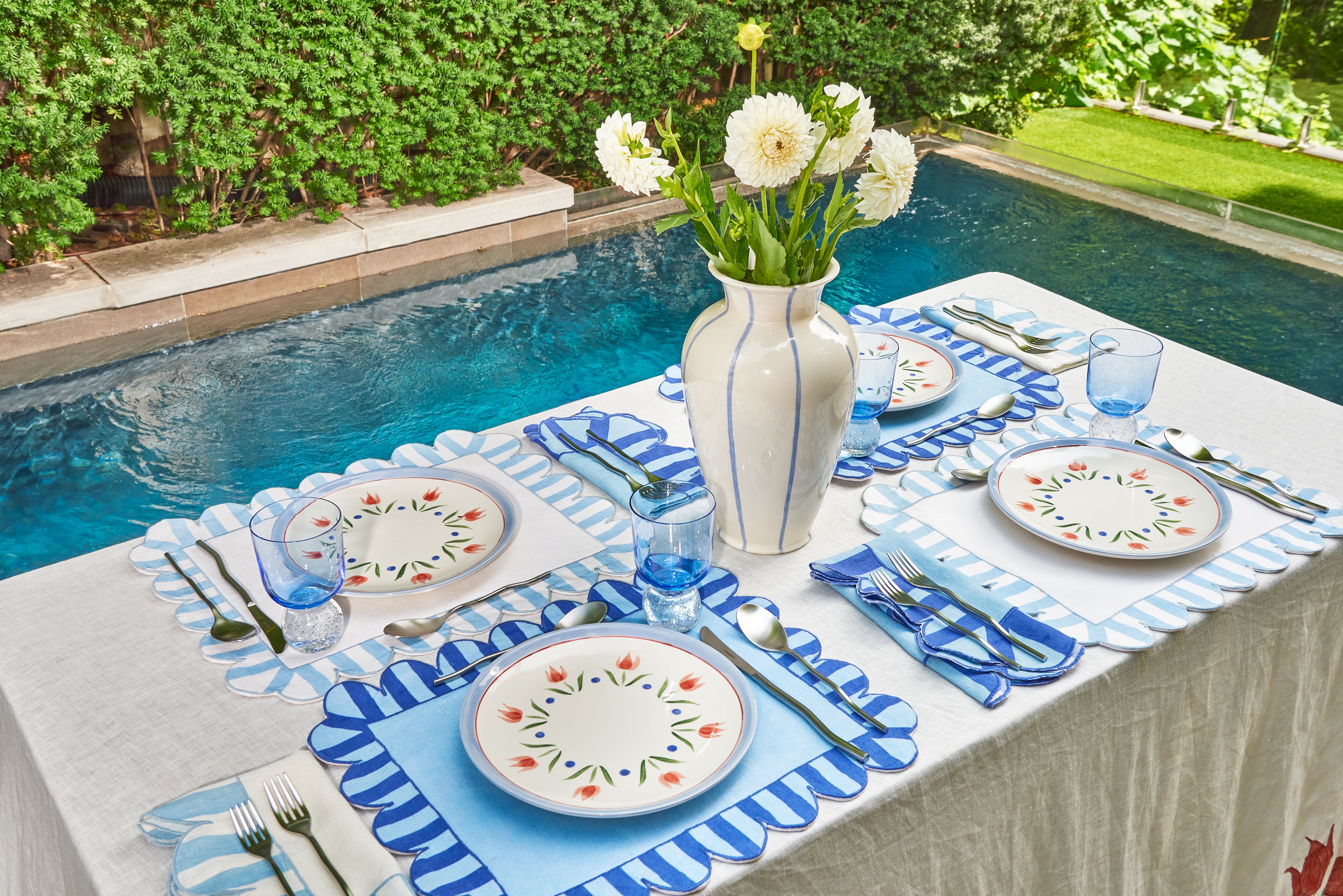 Even the most casual of dinners will feel fun and playful when framed by our candy-striped scalloped placemats. Try mixing and matching with different hues to create a tablescape that's all you. Available in a set of four and packed in a luxurious dustbag, they are machine washable and made from 100-percent structured linen, so the more they wear the better they feel.